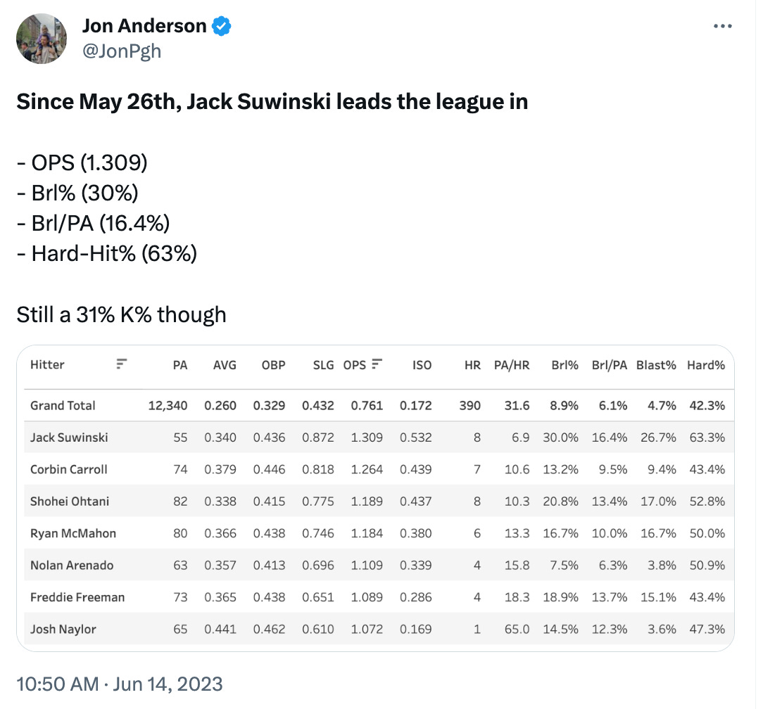 Jack Suwinski - 59 PA, 32 BIP, 9 Brls, 28.1 Brl%
