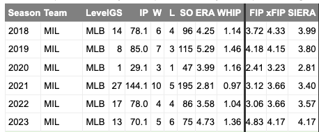 I’d say he’s more likely to be pretty good moving forward as opposed to being bad, so I think he should be started everywhere. The four-seamer and slider have both gotten great whiff rates, but there’s clear inconsistency and he’s not a ground-ball guy, which we don’t love especially in Milwaukee. I think we’re all still a little bit too high on him given that standout 2021 season, and that’s not really fair to him. He’s good, but not great.
