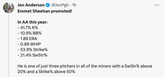 Senga is firmly in the Blake Snell bin. The walk rate is atrocious, but his stuff is so good that you’ll get some absolutely brilliant outings from him. So it’s going to be a wild, bumpy ride. He’s a guy where you just say “at the end of the year, do I think he’ll have helped my team overall?”. If yes, you plug your nose and start him every time. If no, you ditch him and just don’t look at the box score when he strikes out 12. Personally, I’d try to move him after his next great outing. I’d take what I could get and not look back.