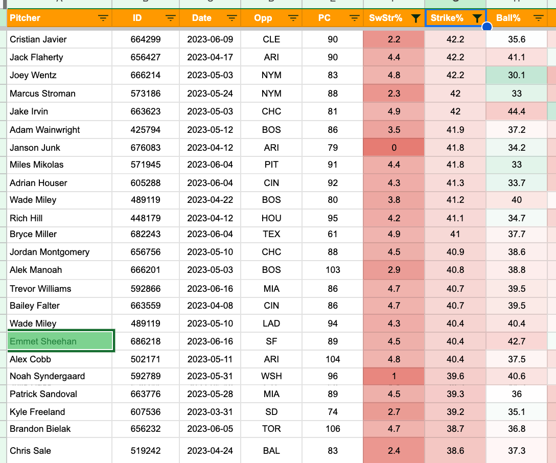 This gives us a good chance to show the power of the new 2023 Individual Start Data sheet. We can filter to similar starts as Sheehan’s outing with the 4.5% SwStr% and the 40.4% Strike%, it’s not a pretty list: