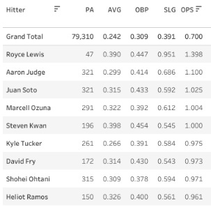 Royce Lewis hit two more homers but it took him two games to do it! He now has a .390/.447/.951 line with seven homers in 47 PAs. That’s a 1.398 OPS with a 22% Brl% and 13% K%, just silly stuff. Here’s a dumb leaderboard - OPS leaders filtered to a 30 PA minimum.