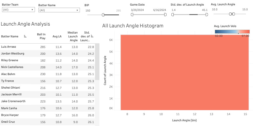 So if you’re looking for hitters actually hitting balls consistently around 10-15 degrees, you should really be looking at more than average LA. There’s a couple ways to do that, you could look at guys around a 12 degree average and then sort by standard deviation to see the guys most consistently around that average. This is only possible on my dashboard, so shout out to me.