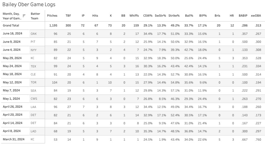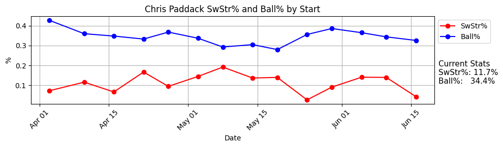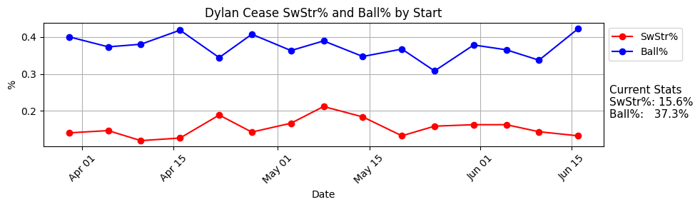 These were his worst two starts of the year by SwStr (7.3% and 7.7%) and Strike% (45.8% and 46.2%). He was extremely hittable and the hitters took advantage (five barrels, four homers, a near .414 BABIP and .437 xwOBA in these two starts).