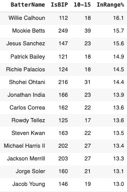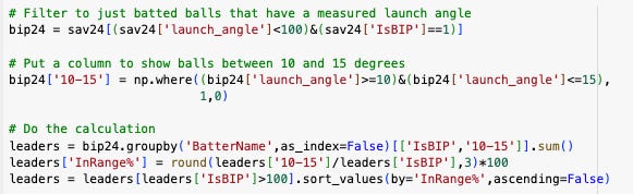 Alternatively we could code up a calculation to see what percent of each hitter’s batted balls are between 10 and 15 degrees. Code for the Python bros: