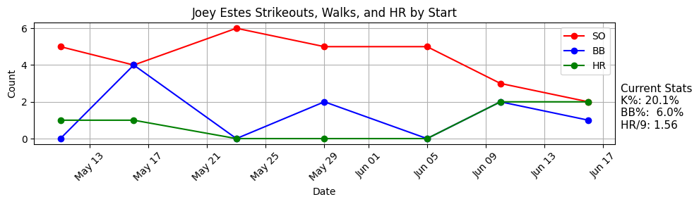 The lesson to be learned is be careful who you’re putting out there. The numbers did look enticing prior to these two starts, I certainly stand by that (12.7% SwStr%, 52% Strike%, 29.7% Ball% prior to last week), but it was on a 408 pitch sample where the strikeout rate was low even with the good numbers. Sample size is everything, and it appears that Estes’ will look worse and worse as the sample grows.