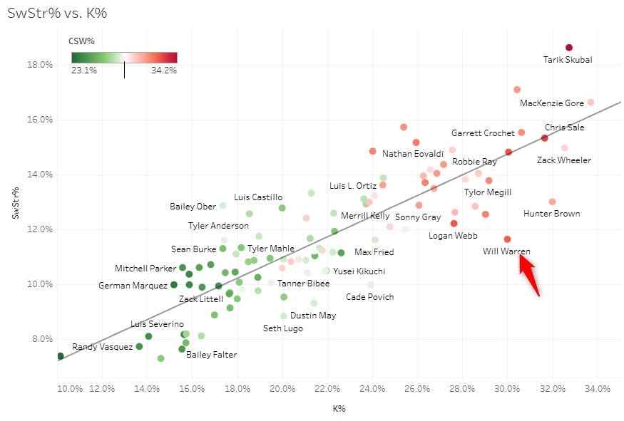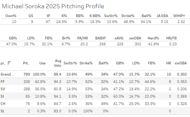 The first thing you see is the strong 18% K-BB%. That gets him to a very good 3.15 JA ERA and a 3.47 SIERA (his ERA is 5.06 by the way). You see that he has strong strike-earning numbers on his four-seamer (52% Strike%, 10.7% SwStr%). And then he has pretty good marks on the slurve as well (14.9% SwStr%).