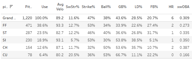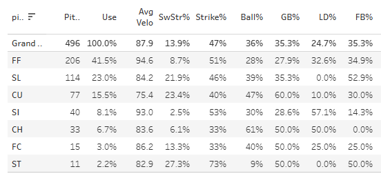He was stopped at 82 pitches, so he probably had another inning in him. He wasn’t efficient with that 40.2% Ball%, but the whiffs are interesting to see. We are six starts in for him now. He’s given us 496 pitches to study. Here are the numbers: