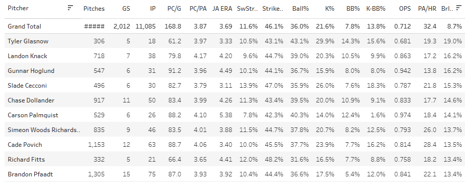 The point of saying that is to point out that this Brl% is almost sure to come way down as Cecconi pitches more. If we look at pitchers with 2,000+ pitches dating back to last season, nobody has a Brl% allowed over 11.5%.