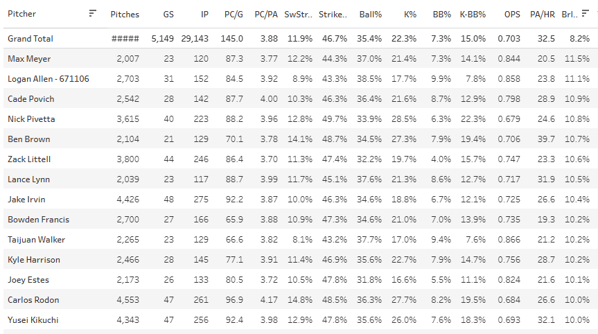 There are only ten SPs with a barrel rate allowed over 13%. Only three of them have made double-digit starts.