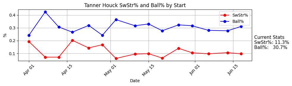 He was bad again giving up five earned runs on seven hits and lasting just four innings. A 3-run homer allowed in the first didn’t help, but the 42.6% Strike% was really bad as well.