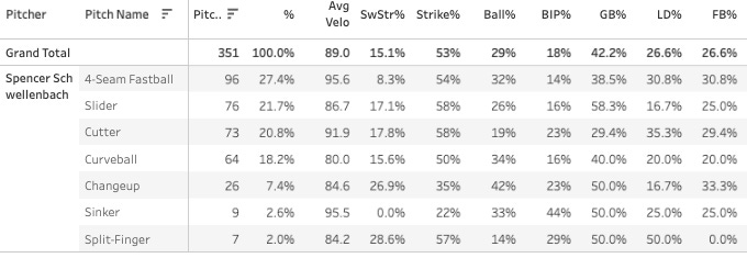 Very efficient. He allowed a bunch of balls in play and they were turned into outs. The 8.5% SwStr% and 39.6% Strike% show us that he wasn’t all that good here and luck was a major factor. The season pitch mix now: