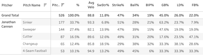 The sample is small, so it’s hard to make any judgements on the kid. The 8.3% SwStr% on the four-seamer is bad, but it’s still earned strikes and he also has this cutter that has worked very well on 73 pitches. And then the slider and curveball have earned strikes at a high rate as well.