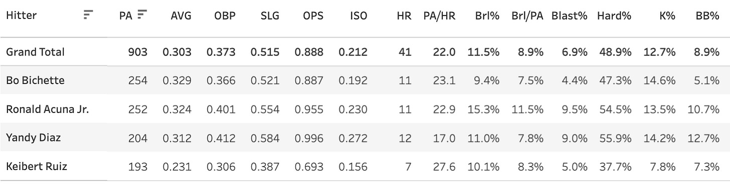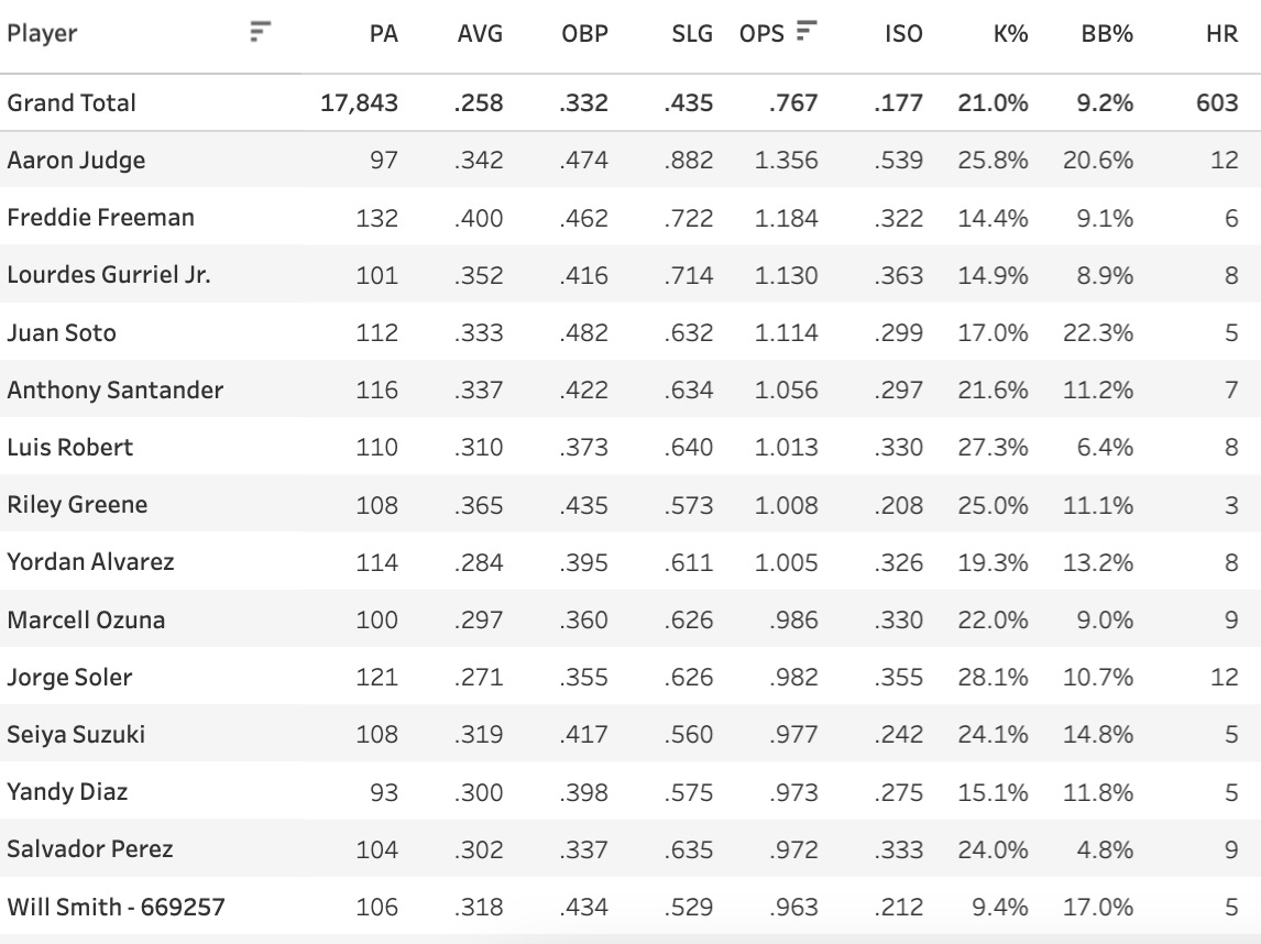 Freddie Freeman - 0.515 xwOBA, 17.6% Brl%, 81.5% Contact%, 24.3% Chase%, 12.1% K%