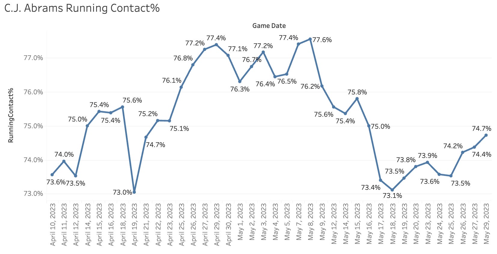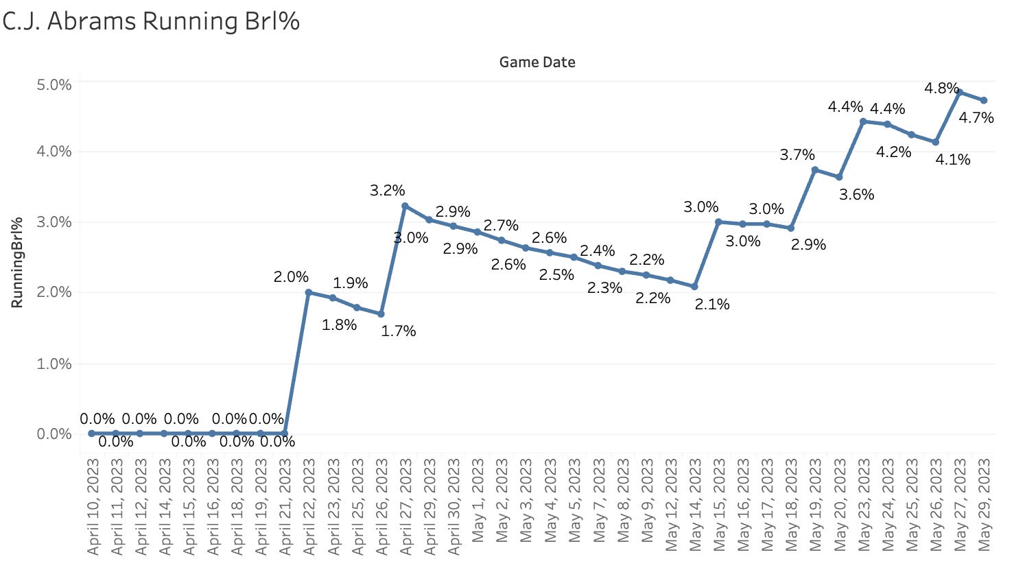 Teammate CJ Abrams is also finally hitting for some power lately, raising the Brl% and Contact% at the same time: