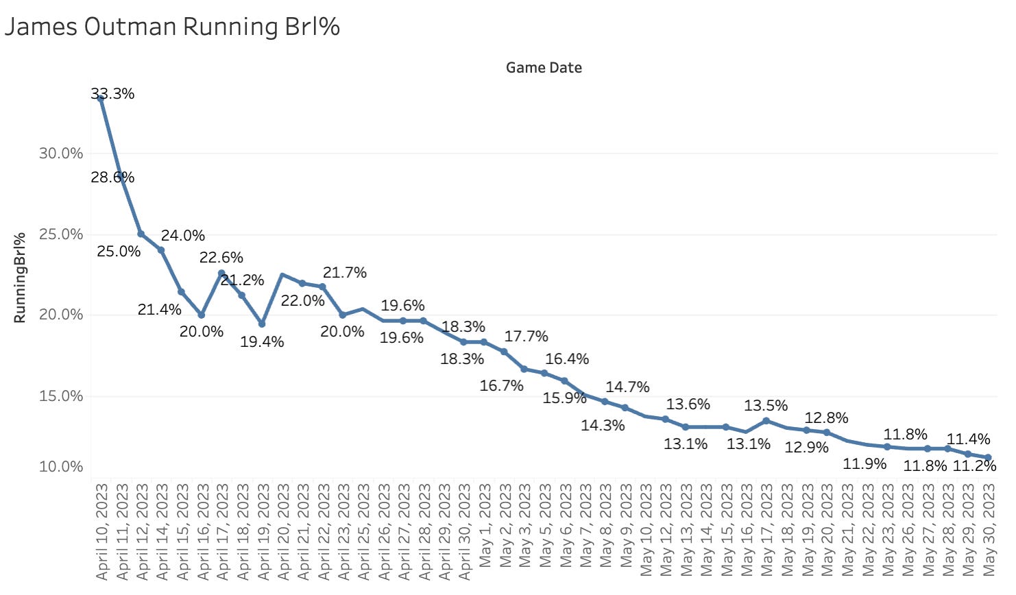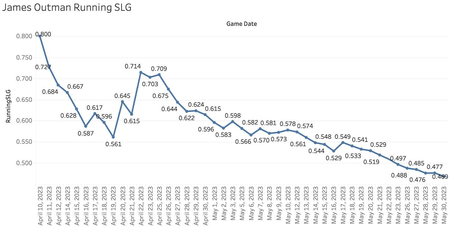 James Outman is really struggling since his hot month of April. The SLG is under .500 now as his contact rate has fallen under 60%.