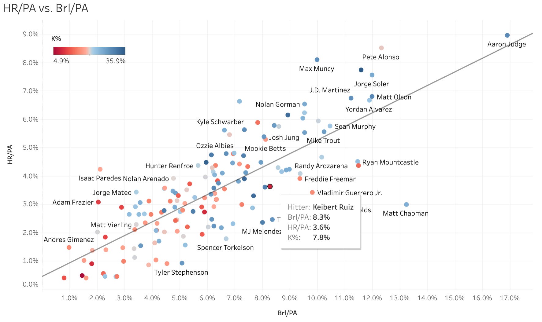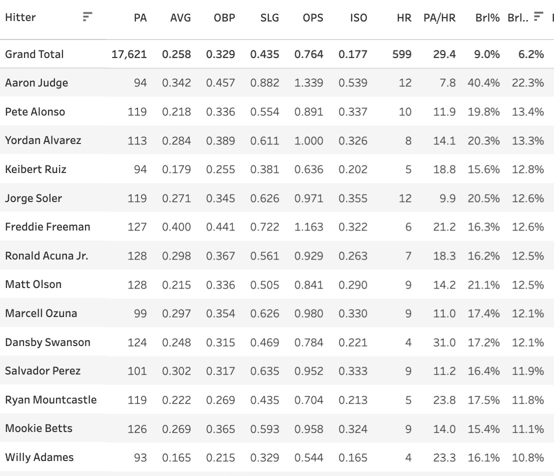 Keibert Ruiz finally got some of what was coming to him. He had been one of the biggest xwOBA-wOBA guys all season and he blasted two homers yesterday on two barrels. He joins an elite group of hitters with Brl% above 9% and K% below 15%:
