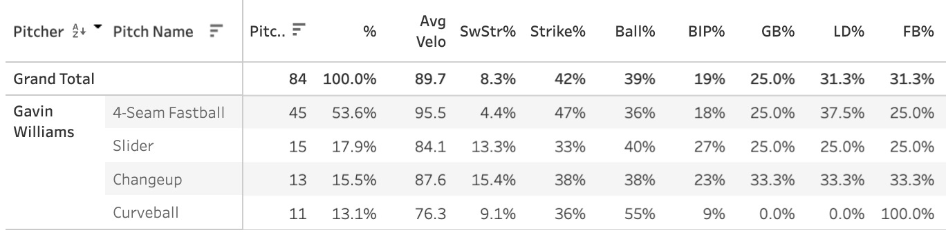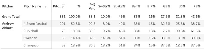 Next is Andrew Abbott, who had an awesome start in his own right. He finally gave up some runs, and he did that in the form of serving up three solo homers, but he posted a 19.3% SwStr% with 17 whiffs, a 54.5% Strike%, and a 10:0 K:BB. That’s pretty elite stuff. That brought his season to this: