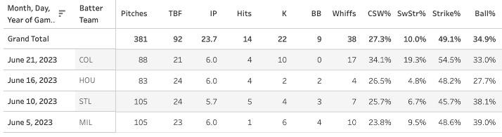 He has just an 8.4% SwStr% on the sinker for the season, so the Twins were definitely doing him some favors last night. His Strike% was also down to 43%, for the season that is at 50%, but he didn’t walk a batter and now has a 3.8% BB% on the year - only Kirby, Greinke, and Syndergaard beat that mark. The only pitchers in the league with a SwStr% above 13% and a BB% below 5% are