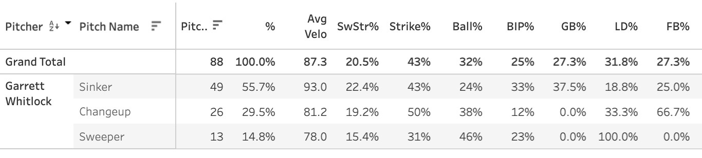 Garrett Whitlock led the day with a 20.5% SwStr%. He earned 18 whiffs, but did give up four runs. The sinker was the main pitch, being used 56% of the time and racking up a 22% SwStr%, which is absurd for a sinker.