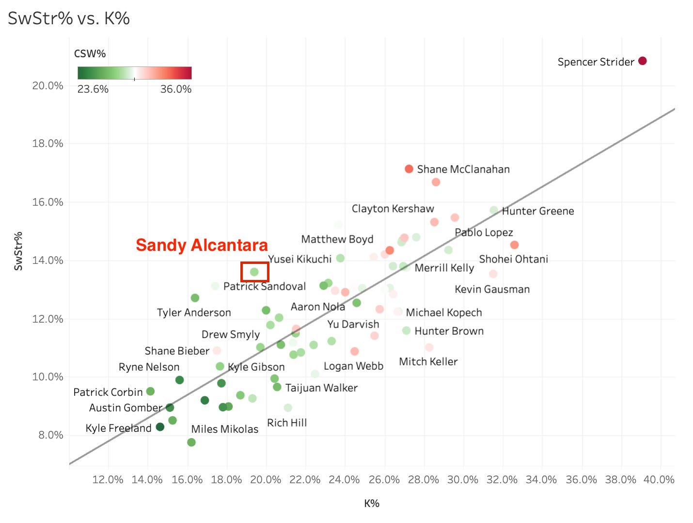 13. Sandy Alcantara (MIA): 45.8 Strike%, 30.2 Ball%