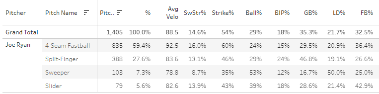 Joe Ryan's FS velo (35 pitches) UP 1.8mph to 85.3