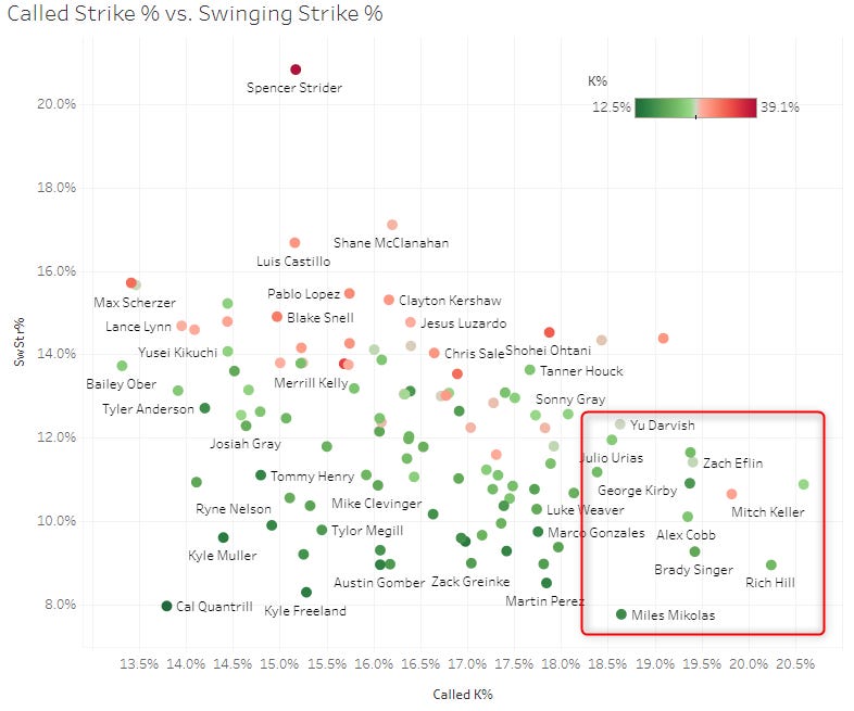 The bottom-right of that plot will be pitchers with high Called K% and low SwStr%. The red dots down there should be guys with expected regression. That means they’re getting a lot of strikeouts without the whiffs, which means they’re building their house on called strikes, which is not solid ground.
