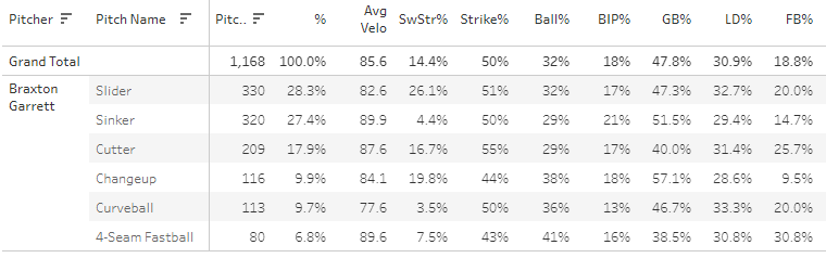 Braxton Garrett - 87 TBF, 36.4% CSW%