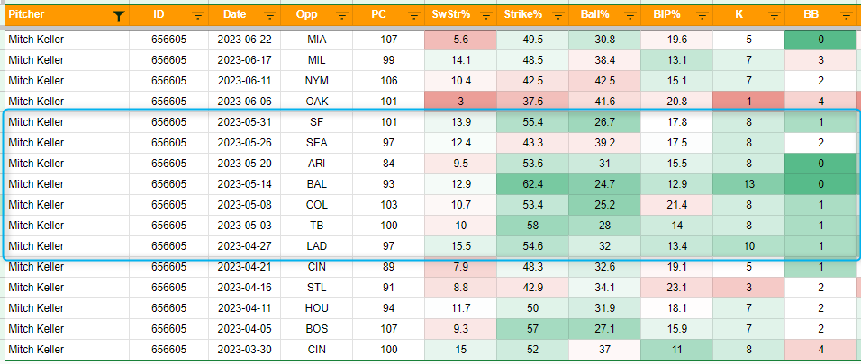 During his really good stretch of starts where he captured everybody’s attention, he was routinely going above 53% with the Strike% but still putting up pretty mediocre SwStr% marks. That means he was getting a ton of called strikes.