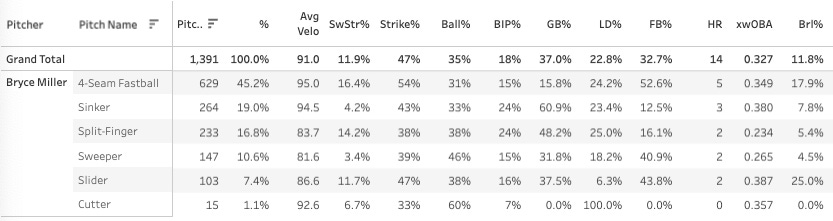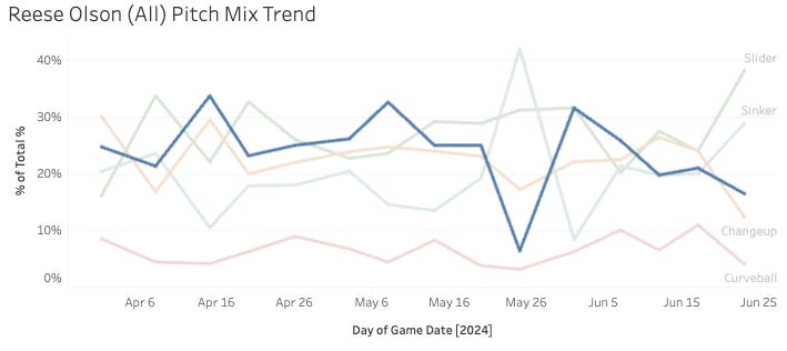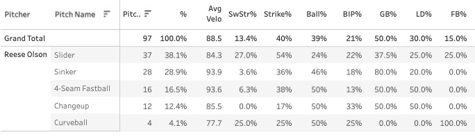 So, the sinker and four-seamer have flipped. Neither pitch is good, but at least he keeps the ball on the ground with the sinker (57%). To me, it makes sense to prefer the sinker to the four-seamer if neither will get whiffs. At least the hard contact on the sinker won’t hurt as much. Keep an eye on that, but my opinion on Olson is not changing - he will have some very good starts and some very bad ones, and overall, I don’t think you’ll love what you’ll get. This seems to be the general rule to follow with pitchers that don’t have a good fastball.