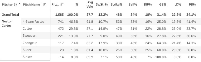 Nestor Cortes has been quietly quite good this year with his 3.40 ERA, 1.07 WHIP, 23.1% K%, and 4.5% BB%. He had one of his better efforts of the year last night: