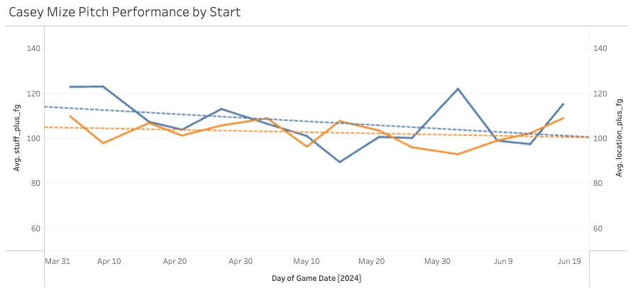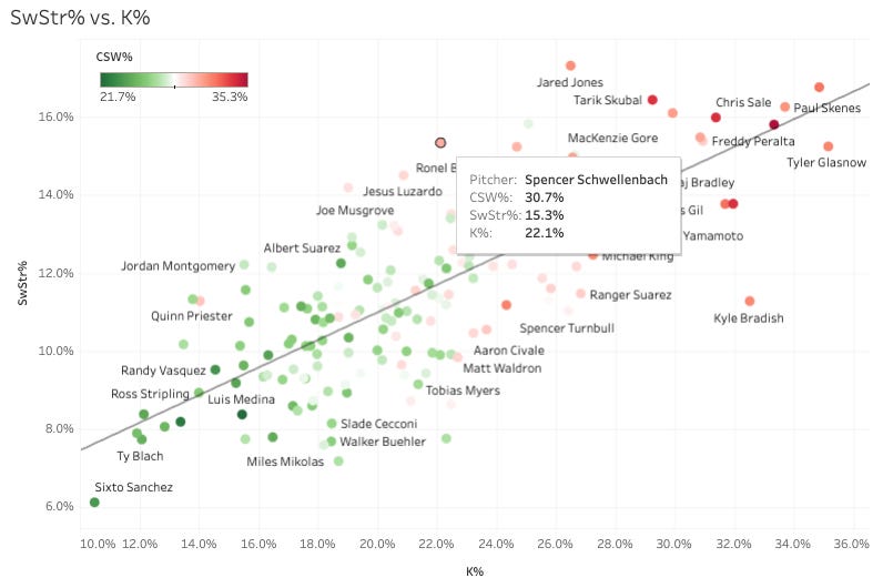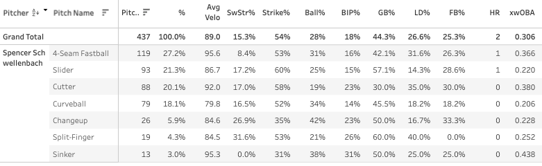 This will be a good test of my methodology here. He is checking all the boxes I want to see, yet the results are just a 5.40 ERA so far. Maybe someday I’ll have a JA-ERA stat where I make my own ERA predictor based on the stuff I like. If that existed today, I promise Schwellenbach would be popping off there.
