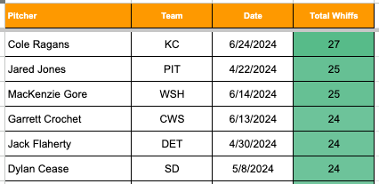 Cole Ragans set a new season-high for any pitcher with 27 whiffs.