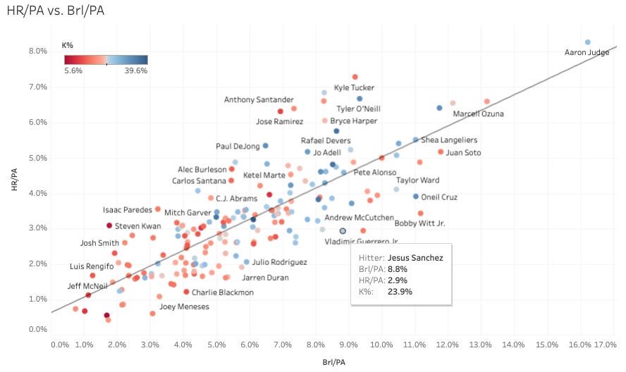 His Pull% was 42% in 2022, 33% last year, and just 27% this year. It’s possible he has stopped trying to pull the ball as much in order to strike out less. That’s the main reason for the high barrel rate and low home run production.