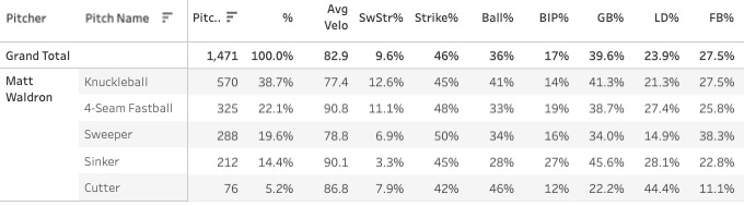 The knuckleball doesn’t look good at all by the numbers, with a 46% Strike% and 36% Ball%. I would tell you how that compares to other knuckleballs, but it doesn’t because there aren’t others. So, Waldron will continue to flummox me.