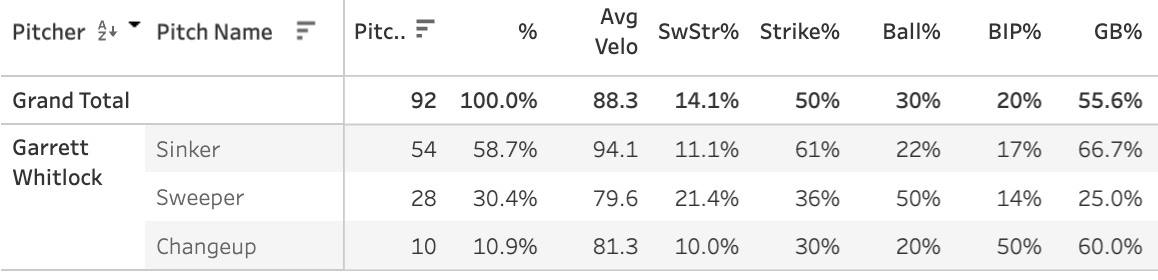 You can see below with Whitlock, he posted a great 14.1% SwStr%, a great 50% Strike%, and even a beautiful 56% GB%, but he gave up two homers and a bunch of hits and that turned into a bad outing in the box score.