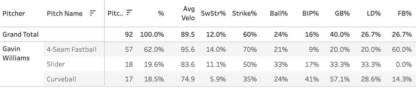 Gavin Williams had a much better start this time. Maybe he took advantage of the Royals, but he had a scoreless start with a beautiful 60% Strike%. The 12% SwStr% is average, but it was still up from last time.