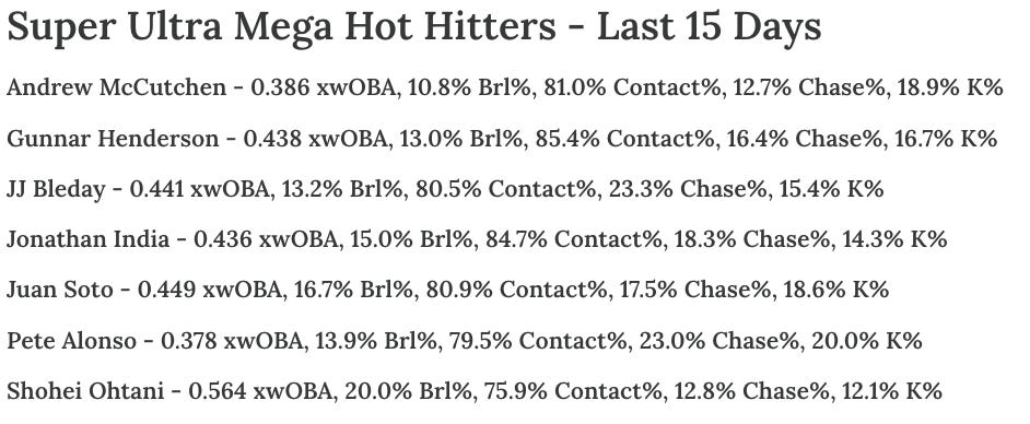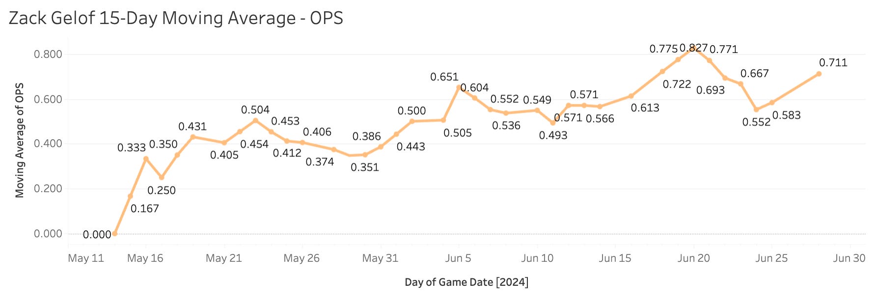 That’s eight homers and nine steals for him. He has a very high 22% stolen base attempt rate and a decent 8.3% Brl%, so the homers and steals are still there. The problem is the massive 35% K%, which leads to this .205 batting average. I think all we need from him is a 28% K% and a .240 batting average for him to be a very good roto fantasy hitter. He’s a 20-20 pace guy pretty easily. But things aren’t moving in the right direction with a 41% K% over the last two weeks. I wouldn’t want to be starting Gelof now for those reasons, but he will likely have some very good fantasy weeks down the stretch with homers and steals.