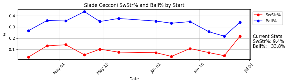 It's good to see him throwing strikes early on. It’s anybody’s guess what his strikeout rate will be at this point in his career. If the early 12.7% SwStr% and 48% Strike is any indication, he’ll be a 24-25% K% guy, but we’ll see.