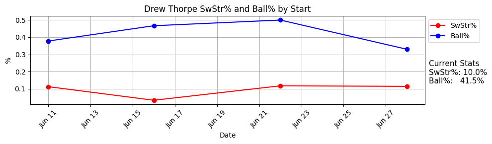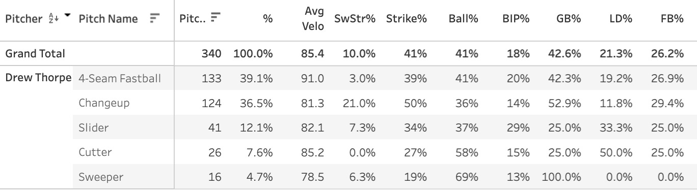 Drew Thorpe's command improved, putting up a 33% Ball%. His season mark is still ridiculously high at 41%, but this was a good step forward.