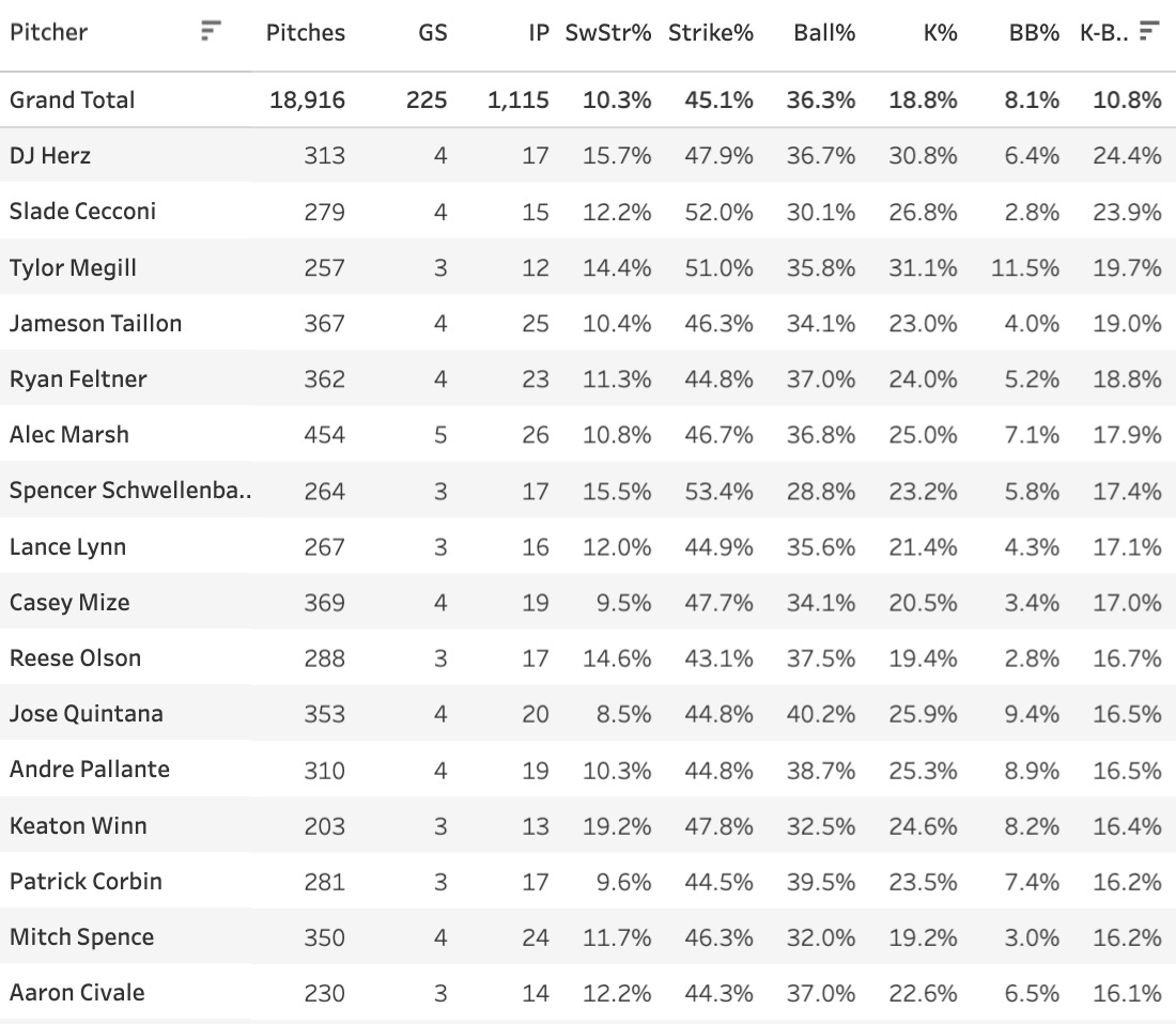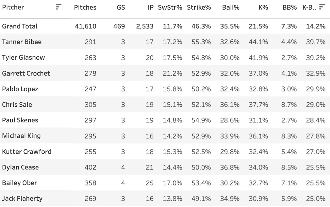 14. Nick Pivetta (BOS): 47.9 Strike%, 31.5 Ball%