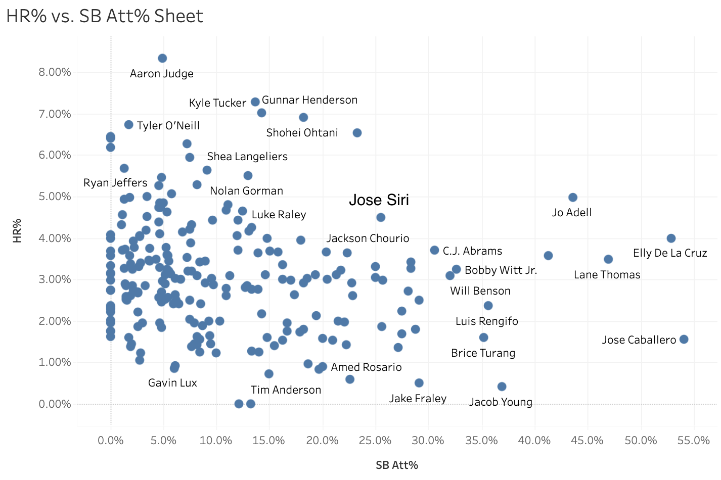The SB attempt rate is 25.5%, very high, and he has homered at a great pace (22 PA/HR). It’s the same problem as Gelof with the absurd strikeout rate that leads to a bad batting average and big slumps, but overall, Siri will probably get around 25 homers and 15 steals; quite valuable in deep fantasy leagues.