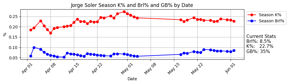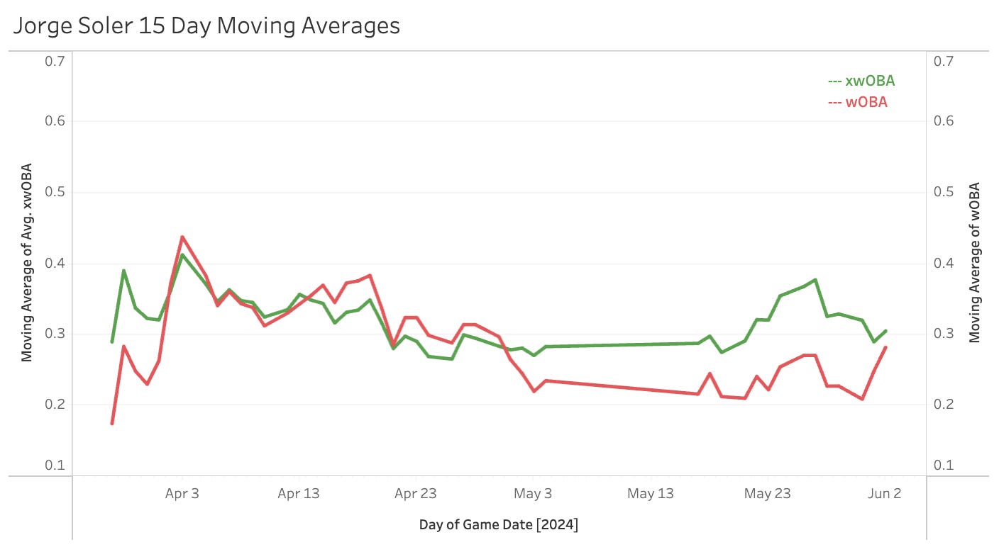 For the year, Soler has a very low 8.5% Brl% (for his standards) and a 22.7% K%. Since May 16th he has a 14% Brl% but just one homer.