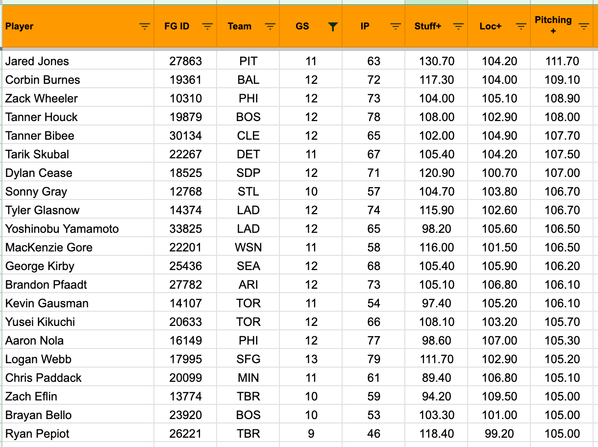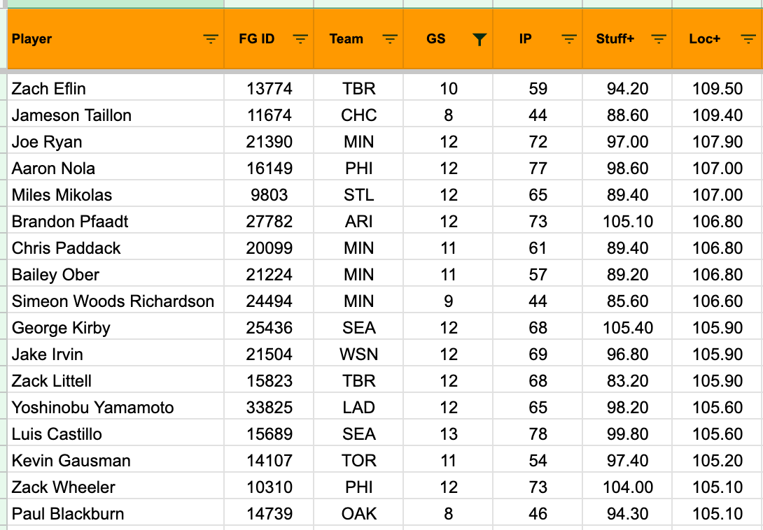 You can see there that only three names have above-average Stuff+ at the same time (Pfaadt, Kirby, Wheeler). And there’s not a ton of correlation with success on this front.