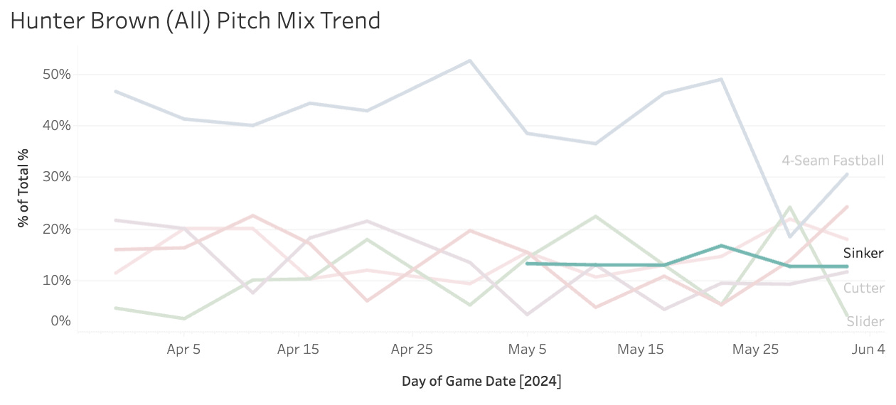 He started throwing a sinker on May 5th, and recently he has really dropped the four-seam usage.