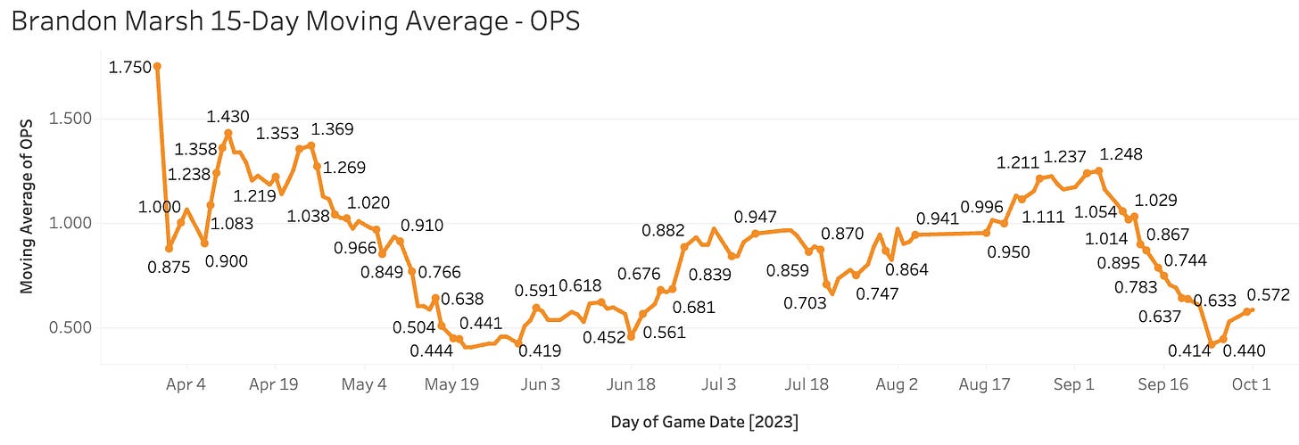 Brandon Marsh is in the “improving contact rates” section here, gaining 10 points on his contact rate over these last thirty days as compared to his years prior.
