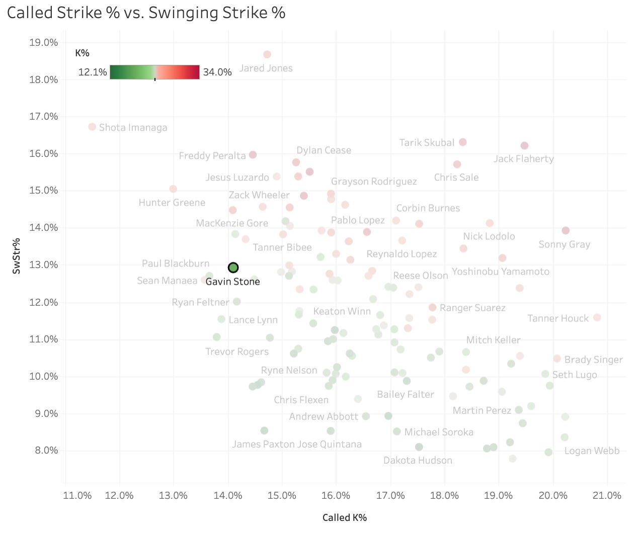 I’ve never really figured out what called strikes are about. Guys that are in the zone a ton will get a lot of called strikes, and command specialists especially will show up well in this category. The average called strike is around the corners, so I guess we could just say that Stone doesn’t paint the corners very well. His overall Location+ this year according to FanGraphs is 100.7, so that’s slightly better than average, but his Stuff+ hasn’t been good at 96.4. It seems like Stone is still a ways away from fantasy relevance if he’s ever even able to get there.