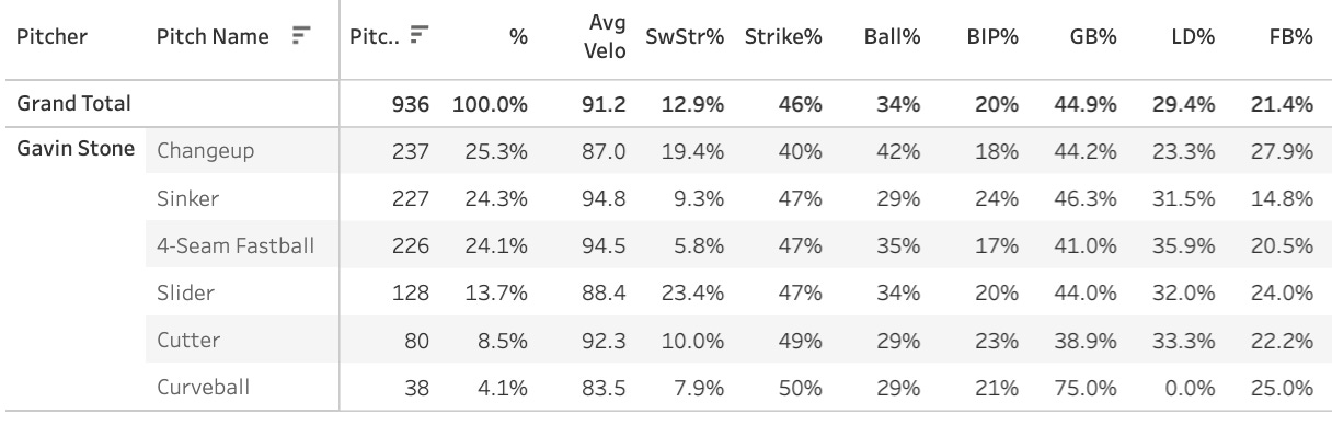 3.62 ERA, 1.11 WHIP, 27.3% K%, 8.3% BB%, 12.6% SwStr%, 36.6% Ball%, 52% GB%