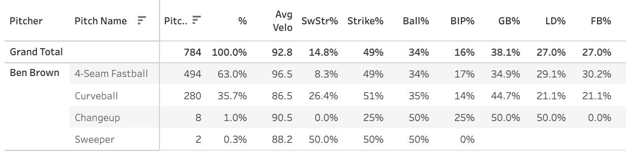 Still not the worst start in the world with a 47.4% Strike%, 34.2% Ball%, and 14.5% SwStr%. His season K-BB% is still 21% with a 14.8% SwStr% and 34% Ball%.