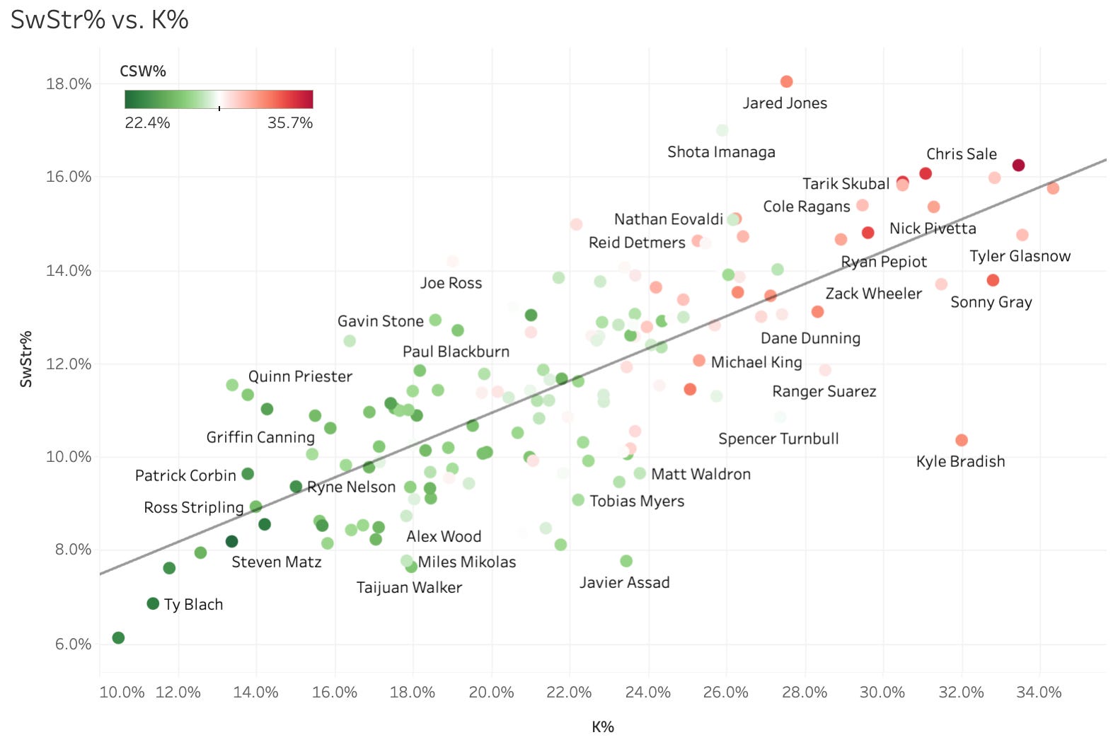 Seeing names like Tanner Houck, Reynaldo Lopez, Bailey Falter, and Luis Gil all in the top 15 makes me feel pretty good about this being a decent indicator of strikeout over-performance. I’d expect all of those guys to do a bit worse in strikeouts moving forward (with Lopez and Gil I was already convinced about that, so this confirms).