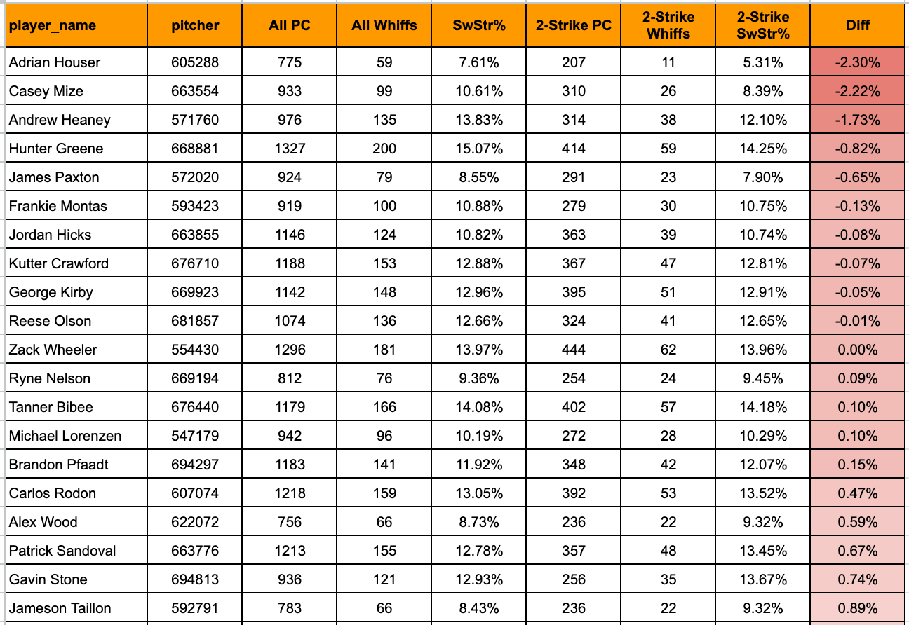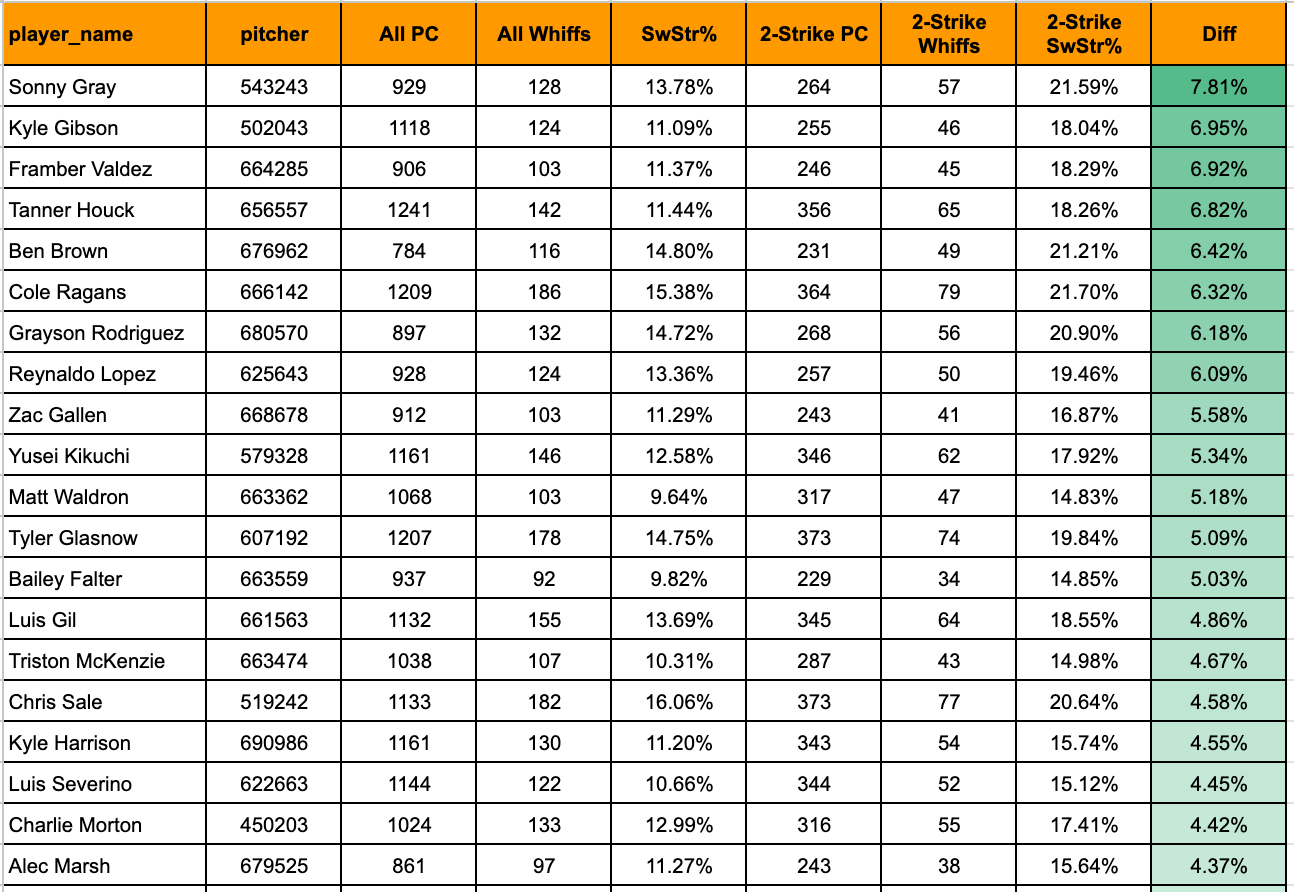 The largest is Sonny Gray, which is not surprising to me. Overall he has a 13.8% SwStr%, but with two strikes he’s way up there at 21.6%. That towers over the rest of the pitchers by 86 points.